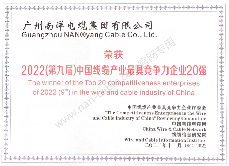 • 2022年度中國線纜行業(yè)最具競爭力企業(yè)20強證書