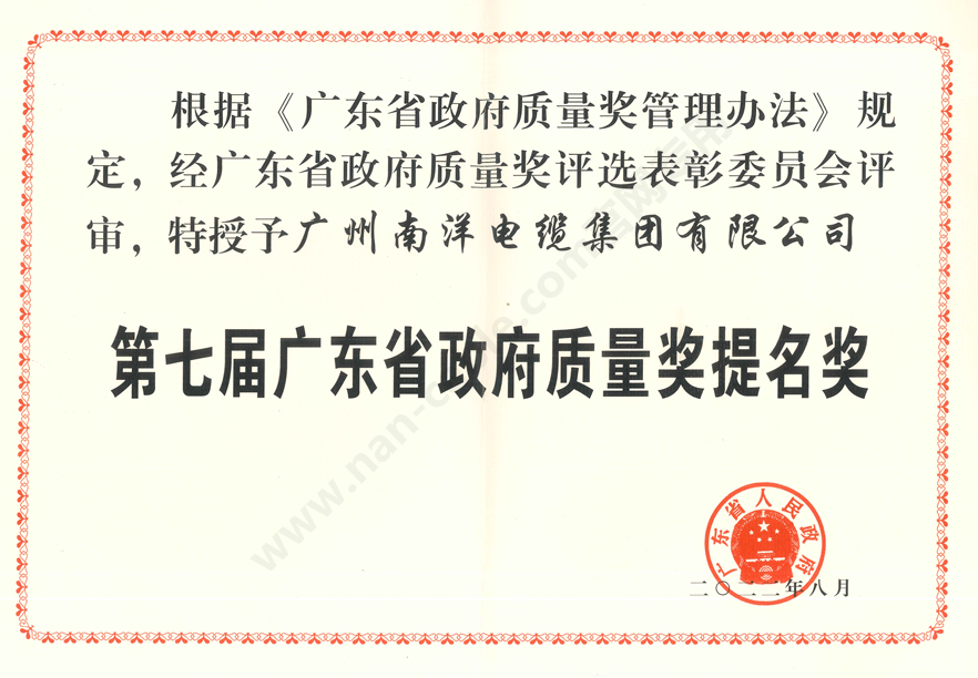 • 第七屆廣東省政府質(zhì)量提名獎證書