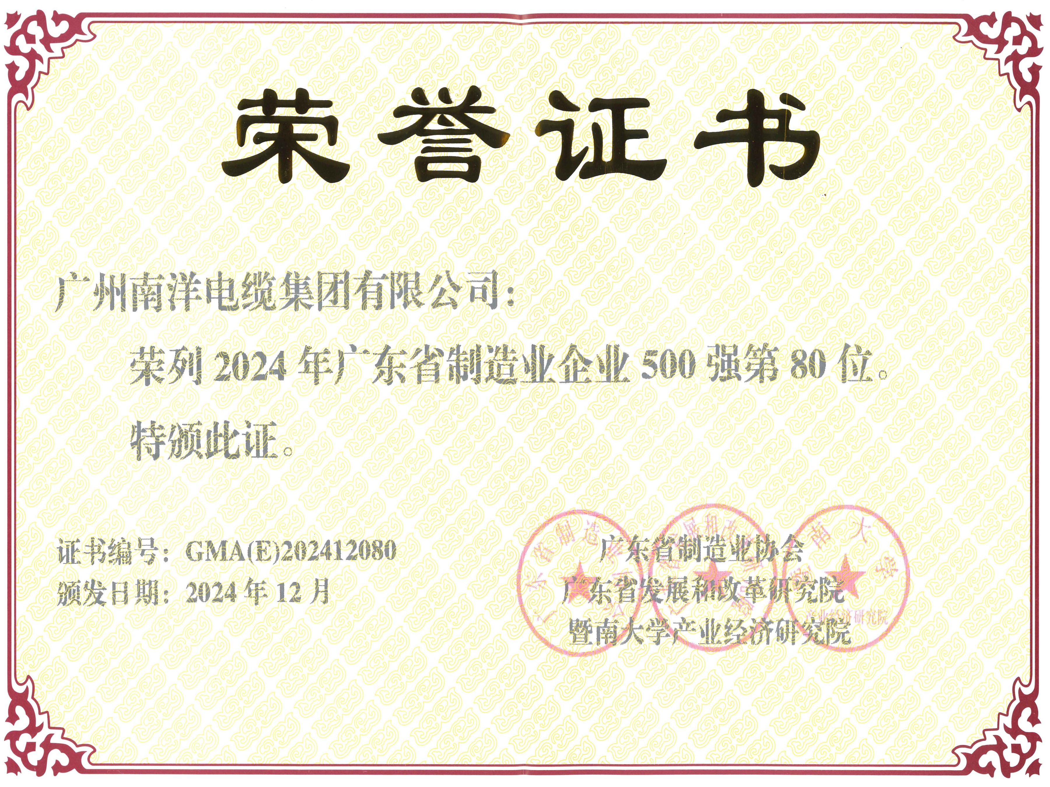 • 2024年廣東省制造業(yè)企業(yè)500強第80位證書