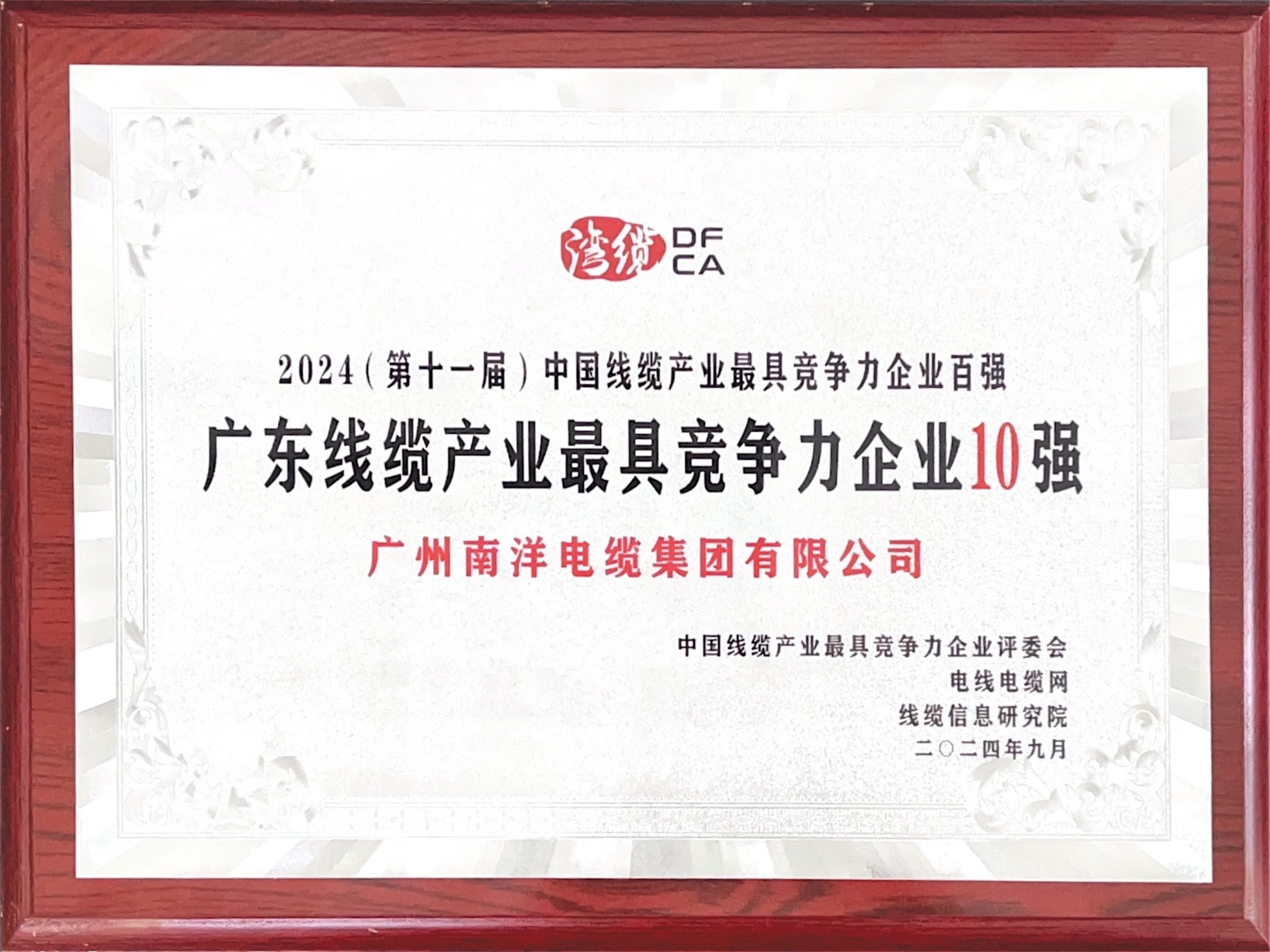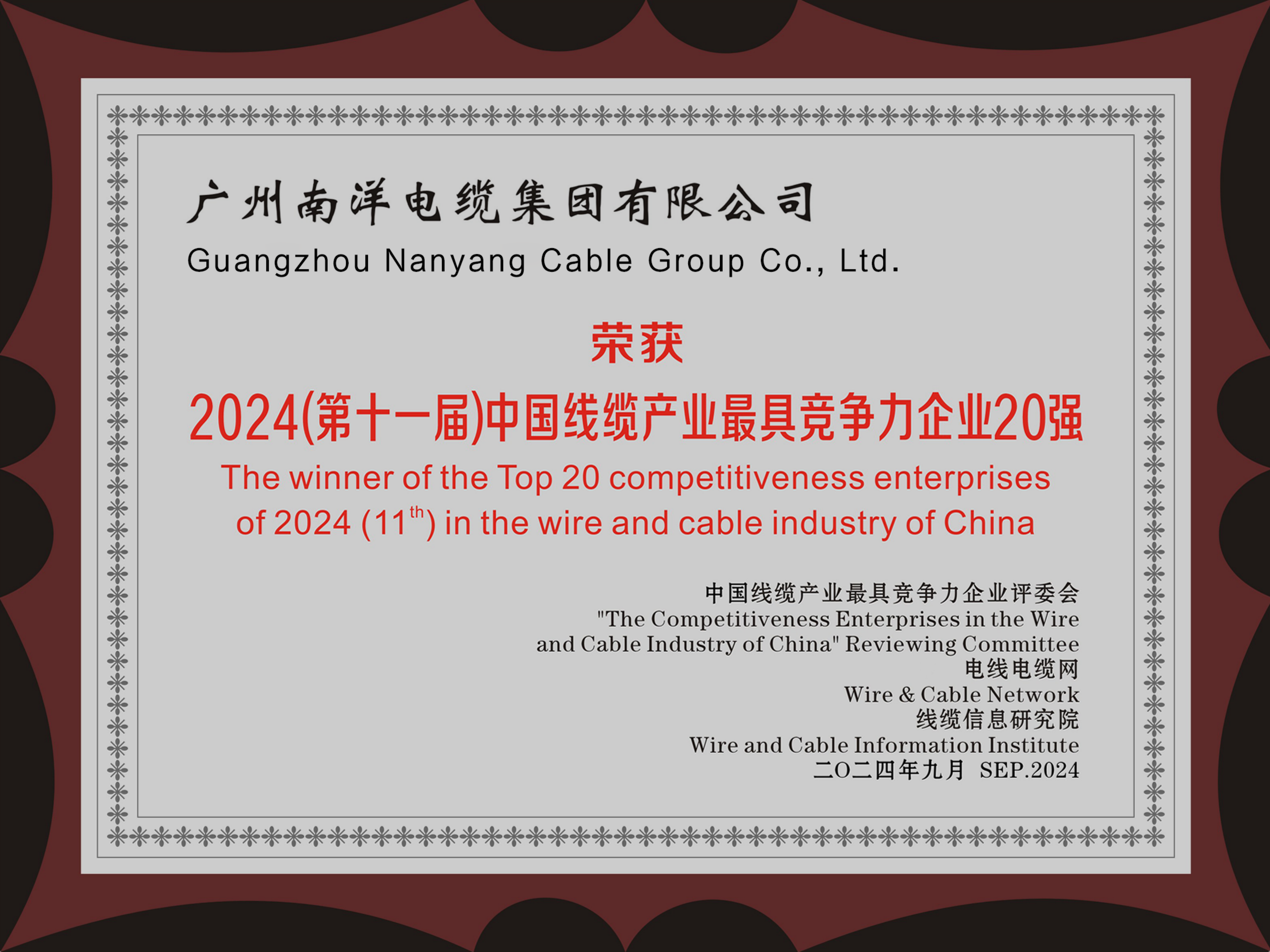• 2024年度中國線纜行業(yè)最具競爭力企業(yè)20強證書